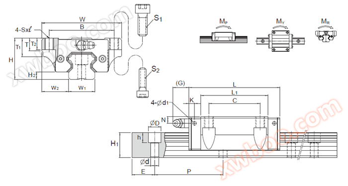 | Modelo | Tamaño del deslizamiento (mm) | Carga nominal básica | Momento muerto permitido | Peso | ||||||||||